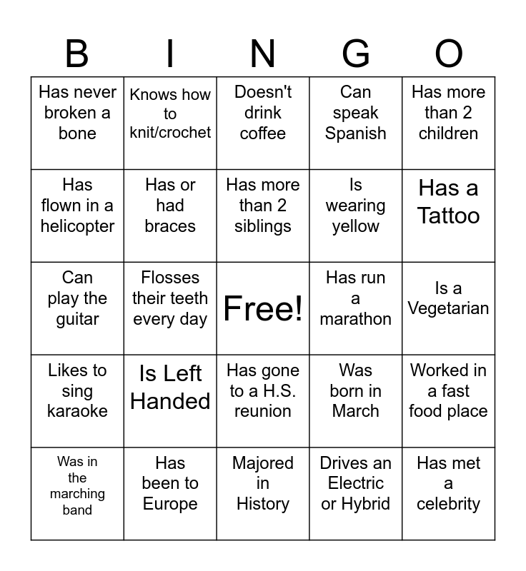 This bingo card has a free space and 24 words: Is Left Handed, Has been to Europe, Has more than 2 siblings, Was in the marching band, Has more than 2 children, Has never broken a bone, Has flown in a helicopter, Knows how to knit/crochet, Has run a marathon, Has gone to a H.S. reunion, Is wearing yellow, Can play the guitar, Was born in March, Worked in a fast food place, Has or had braces, Drives an Electric or Hybrid, Is a Vegetarian, Doesn't drink coffee, Has a Tattoo, Flosses their teeth every day, Has met a celebrity, Likes to sing karaoke, Can speak Spanish and Majored in History.