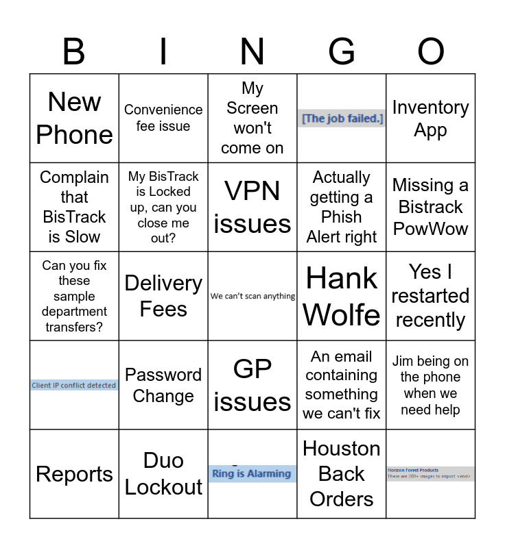 This bingo card has 4 images, a free space and 20 words: Password Change, Duo Lockout, VPN issues, Reports, Inventory App, New Phone, Complain that BisTrack is Slow, Convenience fee issue, Hank Wolfe, GP issues, Actually getting a Phish Alert right, Can you fix these sample department transfers?, An email containing something we can't fix, Jim being on the phone when we need help, My BisTrack is Locked up, can you close me out?, Houston Back Orders, Yes I restarted recently, My Screen won't come on, Missing a Bistrack PowWow and Delivery Fees.