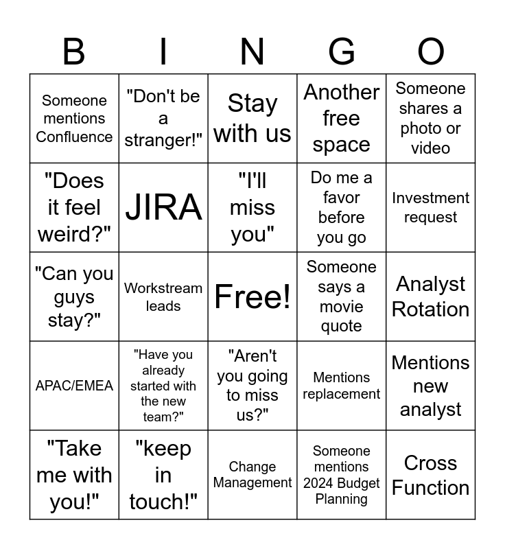This bingo card has a free space and 24 words: "Have you already started with the new team?", "keep in touch!", "I'll miss you", "Take me with you!", Someone shares a photo or video, Someone mentions Confluence, "Does it feel weird?", "Don't be a stranger!", Someone says a movie quote, "Aren't you going to miss us?", Do me a favor before you go, "Can you guys stay?", Mentions replacement, Mentions new analyst, JIRA, Someone mentions 2024 Budget Planning, Analyst Rotation, Stay with us, Investment request, Workstream leads, Cross Function, APAC/EMEA, Another free space and Change Management.