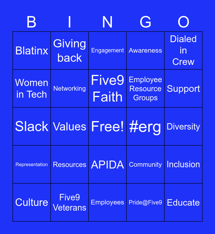 This bingo card has a free space and 26 words: APIDA, Pride@Five9, Five9 Faith, Five9 Veterans, Dialed in Crew, Blatinx, Women in Tech, Giving back, Diversity, Community, Employee Resource Groups, Slack, Inclusion, Culture, Values, Professional Development, Awareness, Representation, Engagement, Educate, Support, Employees, #erg, Resources, Networking and Events.