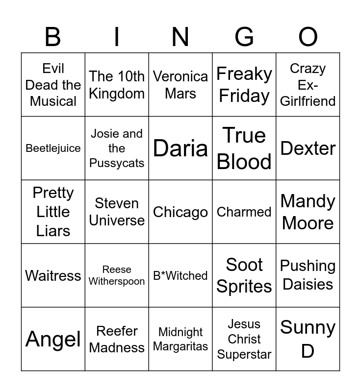 This bingo card has 60 words: Sweeney Todd, Reefer Madness, Rocky Horror Picture Show, Waitress, Jesus Christ Superstar, Repo! The Genetic Opera, Josie and the Pussycats, Music & Lyrics, True Blood, Buffy the Vampire Slayer, Freaky Friday, Little Shop of Horrors, Beetlejuice, Flight of the Conchords, Heathers, Evil Dead the Musical, Chicago, Crazy Ex-Girlfriend, Sing Street, Daria, Charmed, Veronica Mars, Angel, Pushing Daisies, Dead Like Me, Parks and Rec, Santa Clarita Diet, Freaks and Geeks, Dexter, Heroes, Supernatural, Skins, Felicity, Chuck, The 10th Kingdom, Twin Peaks, Adventure Time, Steven Universe, Misfits, Pretty Little Liars, Adamantium, Reese Witherspoon, Mandy Moore, Corn Starch, Soot Sprites, Deep Throat, Mogwai, Weirdos, Hedge Maze, B*Witched, Midnight Margaritas, Sarah Michelle Gellar, Tim Curry, Brian K. Vaughn, Ryan Phillippe, Blue, Needy, Drew Barrymore, Sunny D and Mike Newton.