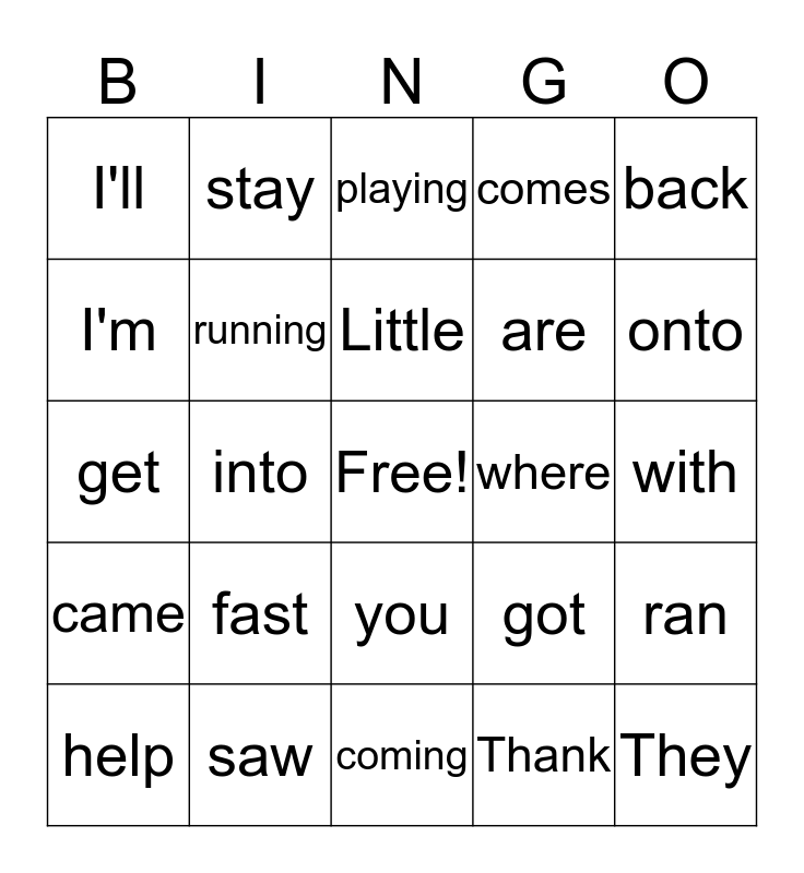 This bingo card has a free space and 24 words: fast, saw, Little, help, back, I'll, I'm, stay, where, you, are, get, got, ran, running, Thank, with, playing, onto, into, They, came, comes and coming.