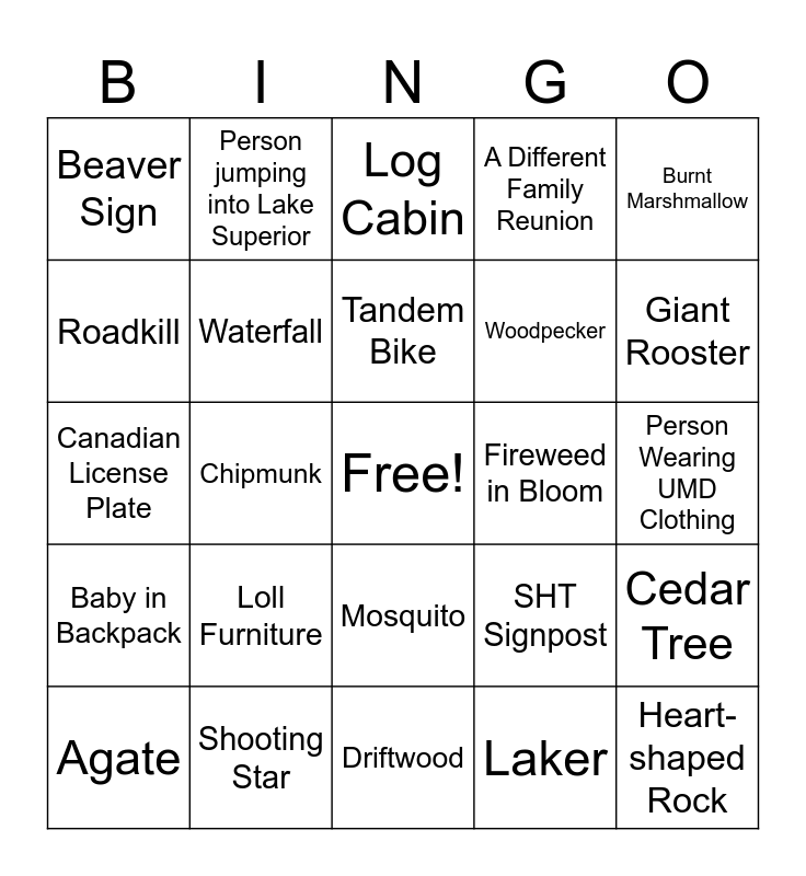This bingo card has a free space and 35 words: Deer, Sunrise on Lake Superior, Kayaks on Lake, Waterfall, Mosquito, A Different Family Reunion, Roadkill, Lighthouse, Tandem Bike, Ripe Berry, Canadian License Plate, Burnt Marshmallow, Bald Eagle, Jumping Fish, Beaver Sign, Fireweed in Bloom, Laker, Chipmunk, Baby in Backpack, Heart-shaped Rock, SHT Signpost, Agate, Cedar Tree, Shooting Star, Log Cabin, Giant Rooster, Sampled Rustic Inn Pie, Ojibwe Language on Sign, Woodpecker, Person Wearing UMD Clothing, Something made by the CCC, Driftwood, Loll Furniture, Person jumping into Lake Superior and A Cliff.