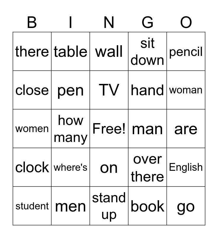 This bingo card has a free space and 34 words: chair, book, desk, erasers, clock, pen, pencil, student, table, teacher, TV, wall, thank you, isn't, man, woman, men, women, where's, over there, on, next, there, are, stand up, go, sit down, open, hand, close, door, how many, English and class.