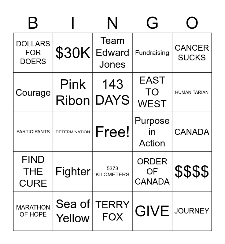 This bingo card has a free space and 67 words: 1980, #dearterry, #ImNotAQuitter, $$$$, $24M GOAL, $250K, $30K, $900 MILLION, 143 DAYS, 42 YEARS, 5373 KILOMETERS, AWARENESS, CANADA, CANCER SUCKS, COMMUNITY IMPACT TOOL, Courage, DETERMINATION, DOLLARS FOR DOERS, DONATION, EAST TO WEST, Fighter, FIND THE CURE, Fundraising, GIVE, GOAL, GP Champions, HERO, HOPE, HUMANITARIAN, IMPACT, JOURNEY, LEGACY, Limited Edition T-SHIRTS!, Living Our Purpose, MAKING A DIFFERENCE, MARATHON OF HOPE, MATCHING DONATIONS, ORDER OF CANADA, PARTICIPANTS, PARTNERSHIP, PAYROLL DEDUCTION, Pink Ribon, Purpose in Action, RESEARCH, RUN, Ryan Reynolds, School RUN, Sea of Yellow, SEPT. 17, SURVIVOR, Team Edward Jones, Team get that victory music bla"ERIN"!, Team Lean Mean Katrine Machines, Team Wayne's World! Winning Time! Excellent!, Team we Klein "Swear"mink we'll win, TERRY FOX, TERRY FOX FOUNDATION, TERRY FOX RUN, TERRY'S DREAM, TRYLIKETERRY, VOLUNTEER, WALK, WARRIOR, WEB5179954, WEB6005747, World without Cancer and X-Canada.