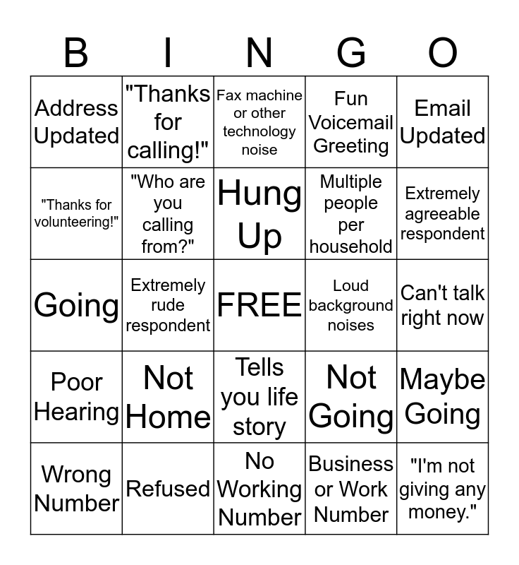 This bingo card has a free space and 24 words: Not Home, Refused, Hung Up, Wrong Number, Email Updated, Address Updated, "Thanks for volunteering!", "Thanks for calling!", Loud background noises, Tells you life story, Multiple people per household, Going, Not Going, Maybe Going, "Who are you calling from?", Business or Work Number, Can't talk right now, Fax machine or other technology noise, Extremely agreeable respondent, Extremely rude respondent, "I'm not giving any money.", Poor Hearing, Fun Voicemail Greeting and No Working Number.