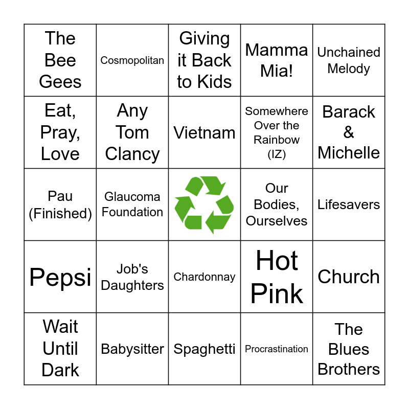 This bingo card has a free space and 57 words: Sophie's Choice, Wait Until Dark, Tina Turner, The Bee Gees, Spaghetti, The Right Stuff, Any Tom Clancy, Elvis, Somewhere Over the Rainbow (IZ), Watermelon, Mamma Mia!, My Sister's Keeper, Planned Parenthood, Salad, Ms. Saigon, How to Be an Anti-Racist, Unchained Melody, Glaucoma Foundation, Dark Chocolate (72%), The Blues Brothers, Our Bodies, Ourselves, The Eagles, Hot Pink, Giving it Back to Kids, Maui, Vietnam, California, Oprah, Barack & Michelle, The Clintons, Chinese Furniture, Hawaiian Lanterns, Stacy's Art, M&Ms, Lifesavers, Eat, Pray, Love, Aloha (Hello, Bye, Breath, Love), Pau (Finished), Pink Wedding Dress, Pepsi, Cosmopolitan, Chardonnay, Delta Zeta Sorority, PTA, Bowling League, Brown Deer Junior Women's Club, Job's Daughters, Babysitter, Nursing Home Aide, St. Mike's Medical Records, Lutheran Hospital, Procrastination, Penny's, Ice Cream, Kihei Canoe Club, Church and Lifesavers.