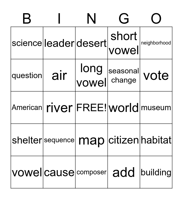 This bingo card has a free space and 63 words: fact families, forest, globe, habitat, healthy, insect, leader, library, long vowel, magnet, map, mountain, museum, neighborhood, ocean, question, river, science, scientist, seasonal change, sequence, shelter, short vowel, sky, spelling, state, statement, story problem, subtract, sum, tempo, town, transportation, USA, vote, vowel, water, add, addend, air, American, world, audience, authority, building, cause, celebration, citizen, city, cloud, coach, composer, conductor, consonant, country, desert, details, dictionary, difference, doubles, earth, effect and emergency.