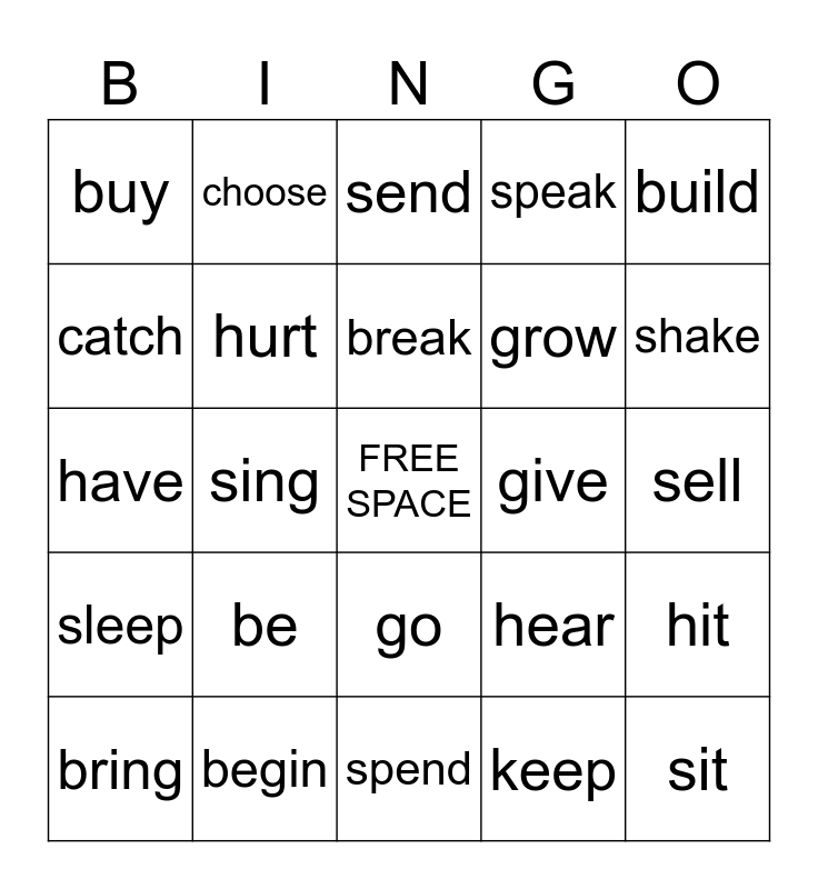 This bingo card has a free space and 24 words: be, begin, break, bring, build, buy, catch, choose, give, go, grow, have, hear, hit, hurt, keep, sell, send, shake, sing, sit, sleep, speak and spend.