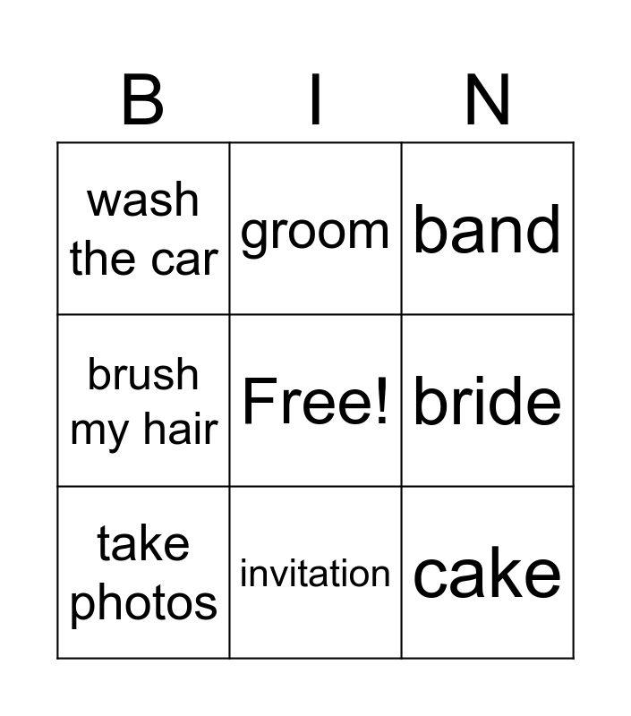 This bingo card has a free space and 12 words: wedding, guests, cake, bride, groom, band, invitation, make a cake, wash the car, brush my hair, take photos and choose a dress.