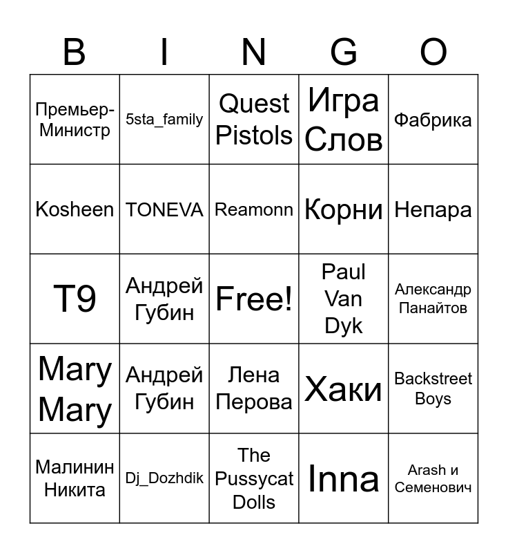 This bingo card has a free space and 72 words: 3 Doors Down, 5sta_family, Андрей Губин, Валерий Меладзе, Женя Отрадная, Иванушки International, Игра Слов, Ирина Ортман, Корни, Ксения Ларина, Малинин Никита, Мария Ржевская, Непара, Премьер-Министр, Рок-Острова, Т9, Хаки, Фабрика, Фактор 2, Александр Панайтов, Андрей Губин, Arash и Семенович, Backstreet Boys, Baha Men, Банд’Эрос, BBMak, BoB, Чи-Ли, Danzel, Destiny Child, Dj_Dozhdik, Другие правила, E-Rotic, Filter Funk, Inna, Иракли, Jem, JoJo, Kosheen, Краски, Лена Перова, Лера Массква, Lil Bow feat Xscape, Los Del Rio, MakSim, Mary Mary, Moby, Modjo, Ne-Yo, O-Zone, Оксана Почепа, One-T, Оскар, Paul Van Dyk, Пропаганда, Queens of the Stone Age, Quest Pistols, Reamonn, Reflex, Revolvers, Shakira, The Black Eyed Peas, The Corrs, The Pussycat Dolls, The Rasmus, Тимати, TONEVA, Total, Турбохода, Винтаж, Вирус and Звери.