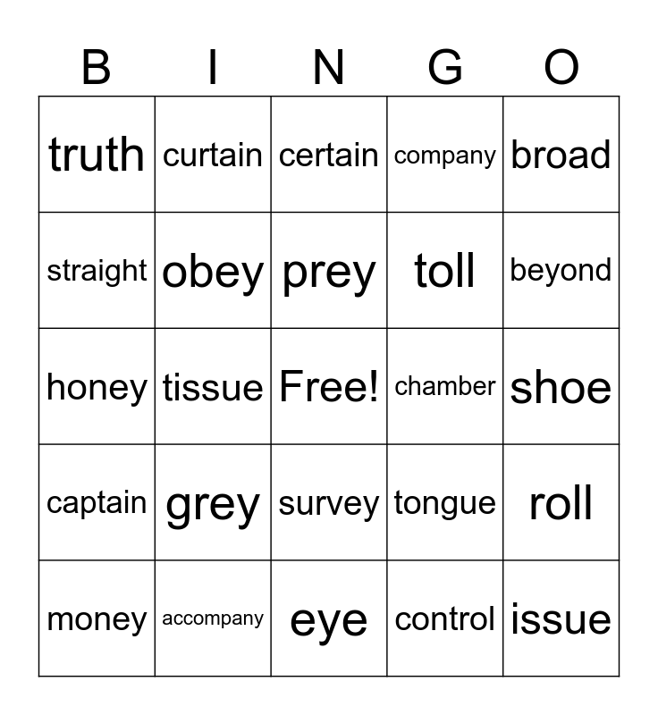 This bingo card has a free space and 28 words: roll, poll, toll, control, straight, certain, curtain, captain, chamber, money, honey, company, accompany, eye, beyond, hey, grey, obey, prey, survey, truth, truly, issue, tissue, shoe, tongue, broad and abroad.