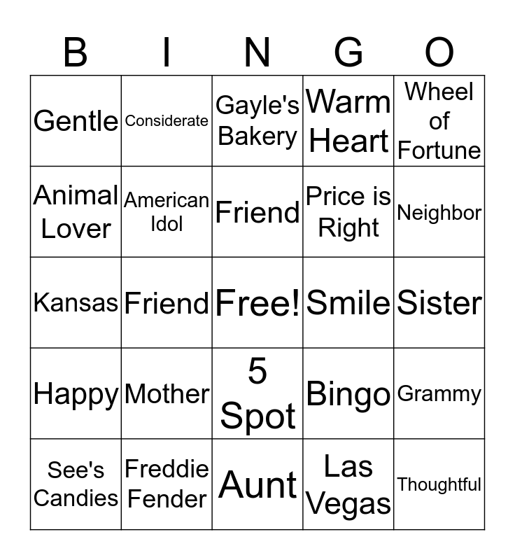 This bingo card has a free space and 24 words: Mother, Freddie Fender, Friend, See's Candies, Wheel of Fortune, Gentle, Animal Lover, Considerate, Smile, 5 Spot, Price is Right, Kansas, Bingo, Grammy, American Idol, Las Vegas, Sister, Gayle's Bakery, Neighbor, Friend, Thoughtful, Happy, Warm Heart and Aunt.