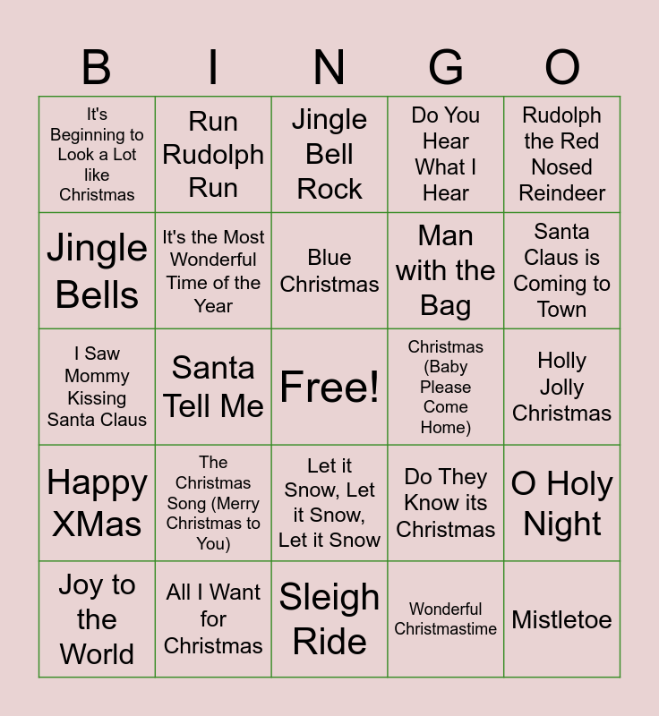 This bingo card has a free space and 30 words: All I Want for Christmas, Last Christmas, Santa Tell Me, Rockin' Around the Christmas Tree, It's Beginning to Look a Lot like Christmas, Jingle Bell Rock, It's the Most Wonderful Time of the Year, Let it Snow, Let it Snow, Let it Snow, Christmas (Baby Please Come Home), Sleigh Ride, Holly Jolly Christmas, Mistletoe, Wonderful Christmastime, Feliz Navidad, Santa Claus is Coming to Town, Winter Winterland, Do They Know its Christmas, Happy XMas, The Christmas Song (Merry Christmas to You), Rudolph the Red Nosed Reindeer, I Saw Mommy Kissing Santa Claus, Frosty the Snowman, Run Rudolph Run, Man with the Bag, Jingle Bells, Do You Hear What I Hear, O Holy Night, Joy to the World, Blue Christmas and Ill Be Home for Christmas.