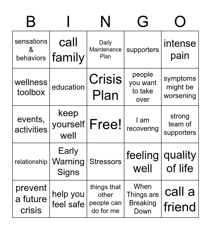 This bingo card has a free space and 42 words: go to the movies, Crisis Plan, Post Crisis Plan, Early Warning Signs, When Things are Breaking Down, quality of life, call a friend, go for a walk, Daily Maintenance Plan, Stressors, strong team of supporters, symptoms might be worsening, keep yourself well, intense pain, difficult time, feeling well, things you want to do, events, activities, people, places, call family, wellness toolbox, develop a plan, thoughts & feelings, sensations & behaviors, getting more rest, stress management, people you want to take over, health care professionals, preferred or acceptable medications, personal responsibility, connection, relationship, education, things that other people can do for me, resuming responsibilities, prevent a future crisis, help you feel safe, I am recovering, personal empowerment, goals and dreams, supporters and Wellness Tools.