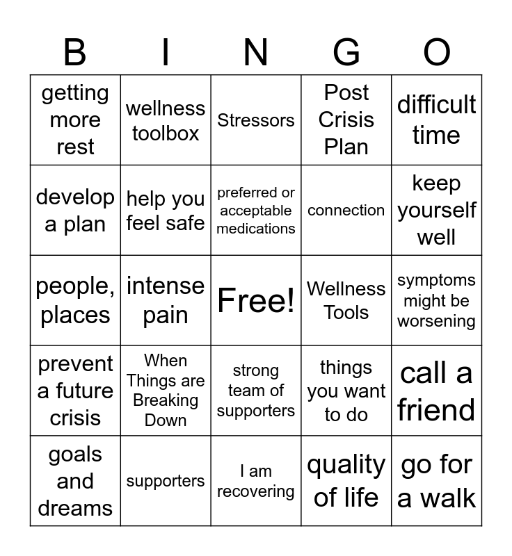 This bingo card has a free space and 42 words: health care professionals, preferred or acceptable medications, personal responsibility, When Things are Breaking Down, quality of life, call a friend, go for a walk, Daily Maintenance Plan, Stressors, strong team of supporters, symptoms might be worsening, keep yourself well, intense pain, difficult time, feeling well, things you want to do, events, activities, people, places, call family, wellness toolbox, develop a plan, thoughts & feelings, sensations & behaviors, getting more rest, stress management, people you want to take over, connection, relationship, education, things that other people can do for me, resuming responsibilities, prevent a future crisis, help you feel safe, I am recovering, personal empowerment, goals and dreams, supporters, Wellness Tools, go to the movies, Crisis Plan, Post Crisis Plan and Early Warning Signs.