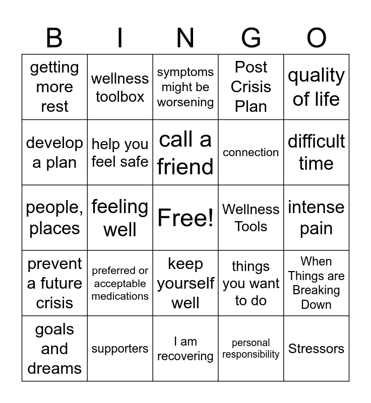 This bingo card has a free space and 42 words: health care professionals, call a friend, go for a walk, preferred or acceptable medications, personal responsibility, When Things are Breaking Down, Stressors, strong team of supporters, symptoms might be worsening, keep yourself well, intense pain, difficult time, feeling well, quality of life, Daily Maintenance Plan, things you want to do, events, activities, people, places, call family, wellness toolbox, develop a plan, thoughts & feelings, sensations & behaviors, getting more rest, stress management, people you want to take over, connection, relationship, education, things that other people can do for me, resuming responsibilities, prevent a future crisis, help you feel safe, I am recovering, personal empowerment, goals and dreams, supporters, Wellness Tools, go to the movies, Crisis Plan, Post Crisis Plan and Early Warning Signs.
