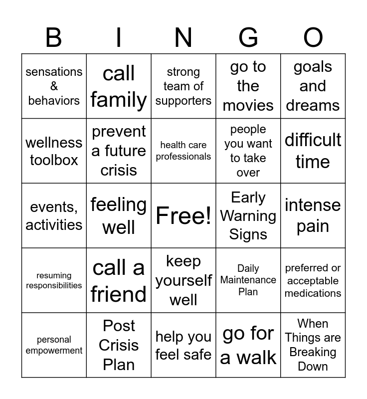 This bingo card has a free space and 42 words: symptoms might be worsening, health care professionals, personal responsibility, call a friend, go for a walk, preferred or acceptable medications, When Things are Breaking Down, Stressors, strong team of supporters, keep yourself well, intense pain, difficult time, feeling well, goals and dreams, quality of life, Daily Maintenance Plan, things you want to do, events, activities, people, places, call family, wellness toolbox, develop a plan, thoughts & feelings, sensations & behaviors, getting more rest, stress management, people you want to take over, connection, relationship, education, things that other people can do for me, resuming responsibilities, prevent a future crisis, help you feel safe, I am recovering, personal empowerment, Post Crisis Plan, Early Warning Signs, supporters, Wellness Tools, go to the movies and Crisis Plan.