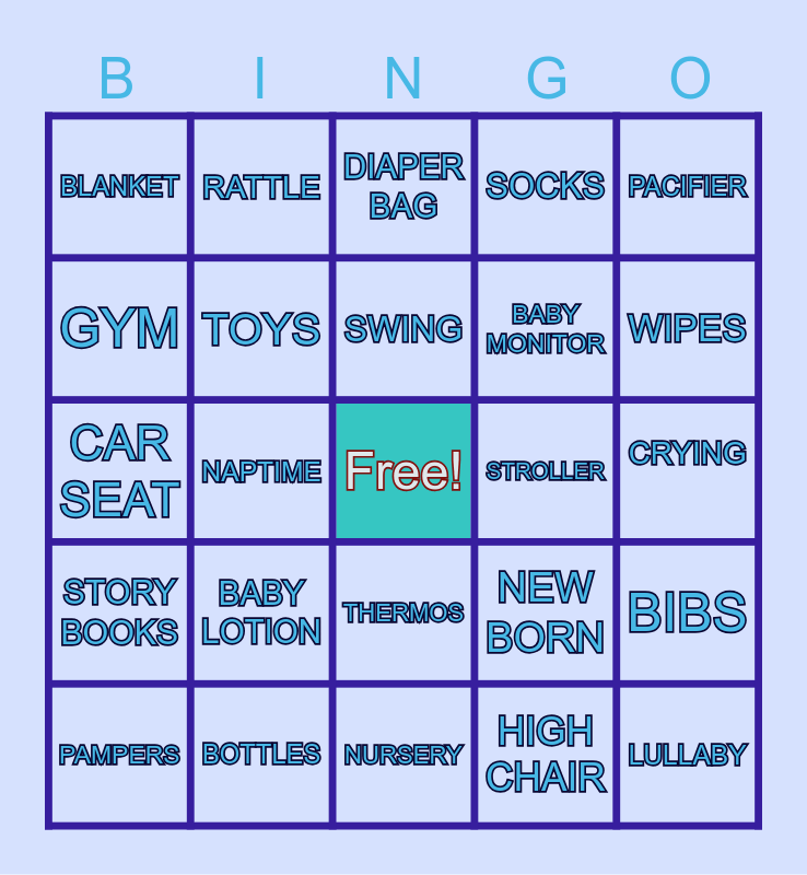 This bingo card has a free space and 29 words: CRIB, BOTTLES, DIAPER BAG, BABY'S NAME, PACIFIER, BLANKET, TOYS, SWING, STROLLER, BIBS, PAMPERS, NAPTIME, HIGH CHAIR, LULLABY, CAR SEAT, GIFTS, NURSERY, NEW BORN, WIPES, STORY BOOKS, BABY LOTION, FORMULA, BABY MONITOR, CRYING, GYM, RATTLE, THERMOS, SOCKS and BLOCKS.