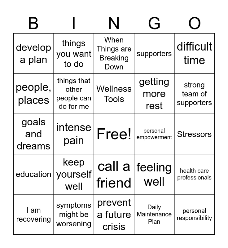 This bingo card has a free space and 42 words: resuming responsibilities, Wellness Tools, go for a walk, keep yourself well, Daily Maintenance Plan, health care professionals, personal responsibility, preferred or acceptable medications, When Things are Breaking Down, call a friend, Stressors, strong team of supporters, intense pain, difficult time, events, activities, feeling well, Crisis Plan, goals and dreams, quality of life, things you want to do, people, places, call family, wellness toolbox, develop a plan, thoughts & feelings, sensations & behaviors, getting more rest, stress management, people you want to take over, connection, relationship, education, things that other people can do for me, prevent a future crisis, help you feel safe, I am recovering, symptoms might be worsening, personal empowerment, Post Crisis Plan, Early Warning Signs, supporters and go to the movies.