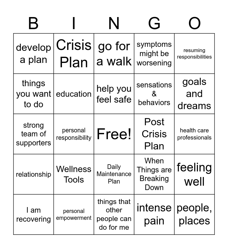 This bingo card has a free space and 42 words: keep yourself well, help you feel safe, difficult time, Wellness Tools, intense pain, feeling well, people, places, connection, go for a walk, Daily Maintenance Plan, health care professionals, goals and dreams, personal responsibility, resuming responsibilities, preferred or acceptable medications, When Things are Breaking Down, call a friend, strong team of supporters, events, activities, Crisis Plan, things you want to do, call family, wellness toolbox, develop a plan, quality of life, thoughts & feelings, sensations & behaviors, getting more rest, stress management, Stressors, people you want to take over, relationship, education, things that other people can do for me, prevent a future crisis, I am recovering, personal empowerment, Post Crisis Plan, Early Warning Signs, supporters, symptoms might be worsening and go to the movies.