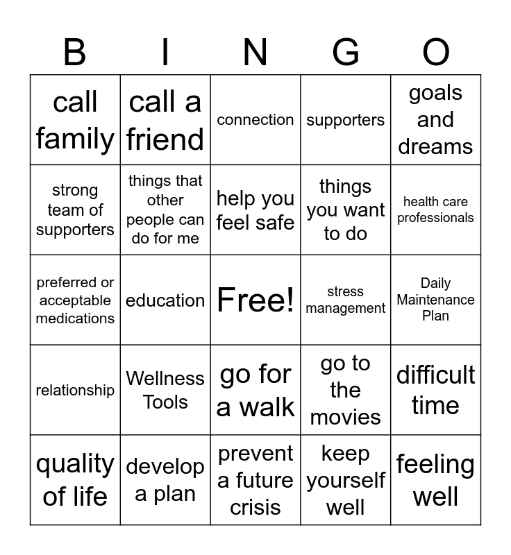 This bingo card has a free space and 42 words: personal empowerment, help you feel safe, Stressors, Wellness Tools, keep yourself well, difficult time, feeling well, people, places, connection, go for a walk, Daily Maintenance Plan, health care professionals, education, goals and dreams, personal responsibility, go to the movies, resuming responsibilities, preferred or acceptable medications, When Things are Breaking Down, call a friend, strong team of supporters, events, activities, Crisis Plan, call family, wellness toolbox, thoughts & feelings, things you want to do, intense pain, sensations & behaviors, getting more rest, people you want to take over, relationship, things that other people can do for me, prevent a future crisis, I am recovering, quality of life, develop a plan, stress management, Post Crisis Plan, Early Warning Signs, supporters and symptoms might be worsening.