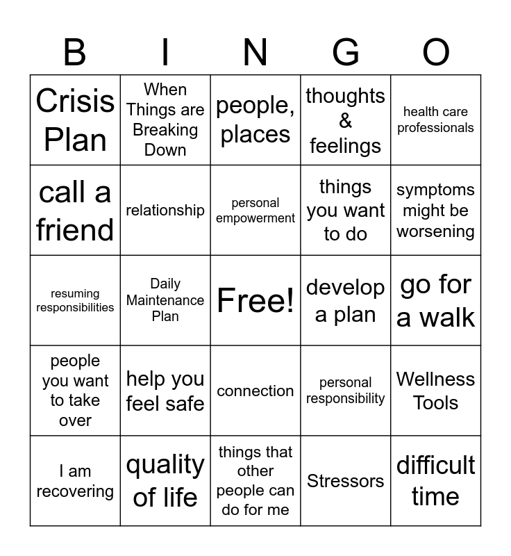 This bingo card has a free space and 42 words: education, personal empowerment, Post Crisis Plan, help you feel safe, Stressors, Wellness Tools, difficult time, feeling well, people, places, connection, go for a walk, symptoms might be worsening, Daily Maintenance Plan, health care professionals, goals and dreams, personal responsibility, go to the movies, resuming responsibilities, preferred or acceptable medications, When Things are Breaking Down, call a friend, strong team of supporters, events, activities, Crisis Plan, call family, wellness toolbox, things you want to do, intense pain, sensations & behaviors, getting more rest, keep yourself well, people you want to take over, relationship, things that other people can do for me, prevent a future crisis, I am recovering, quality of life, develop a plan, stress management, Early Warning Signs, thoughts & feelings and supporters.
