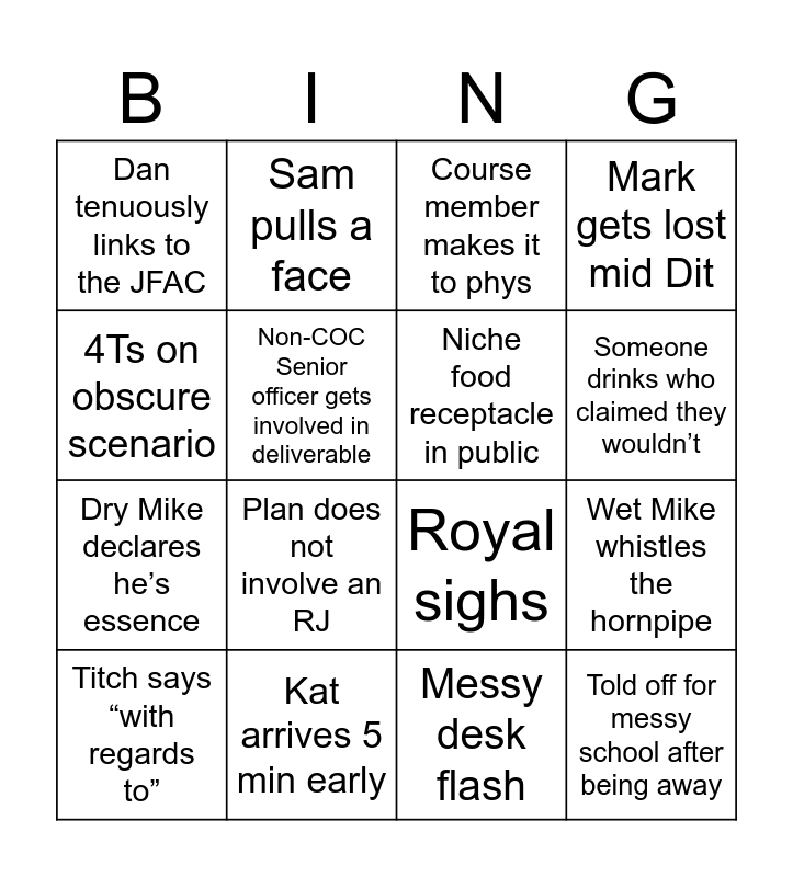 This bingo card has 16 words: Kat arrives 5 min early, Wet Mike whistles the hornpipe, Course member makes it to phys, Dan tenuously links to the JFAC, Dry Mike declares he’s essence, Sam pulls a face, Royal sighs, Messy desk flash, 4Ts on obscure scenario, Non-COC Senior officer gets involved in deliverable, Titch says “with regards to”, Mark gets lost mid Dit, Plan does not involve an RJ, Someone drinks who claimed they wouldn’t, Niche food receptacle in public and Told off for messy school after being away.