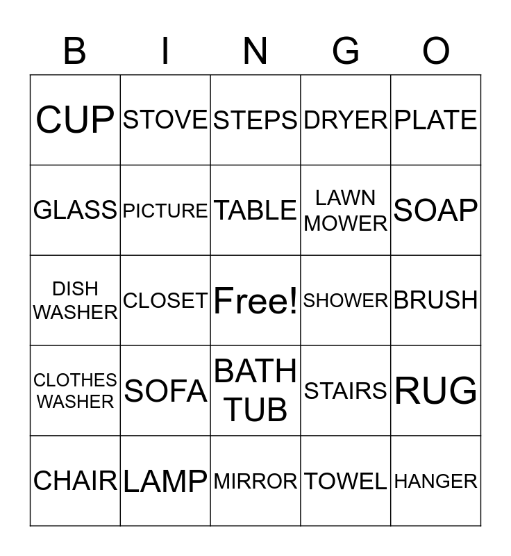 This bingo card has a free space and 24 words: SOFA, LAMP, TABLE, CHAIR, PLATE, CUP, GLASS, STOVE, SHOWER, BATH TUB, LAWN MOWER, DISH WASHER, STAIRS, RUG, PICTURE, TOWEL, BRUSH, STEPS, SOAP, CLOSET, HANGER, CLOTHES WASHER, DRYER and MIRROR.