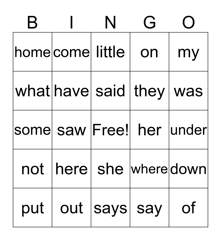 This bingo card has a free space and 24 words: here, out, said, put, my, home, what, come, her, she, they, some, where, down, have, say, under, little, was, saw, of, not, on and says.