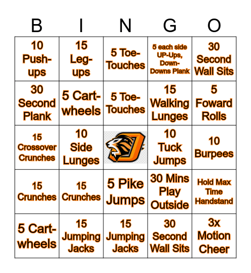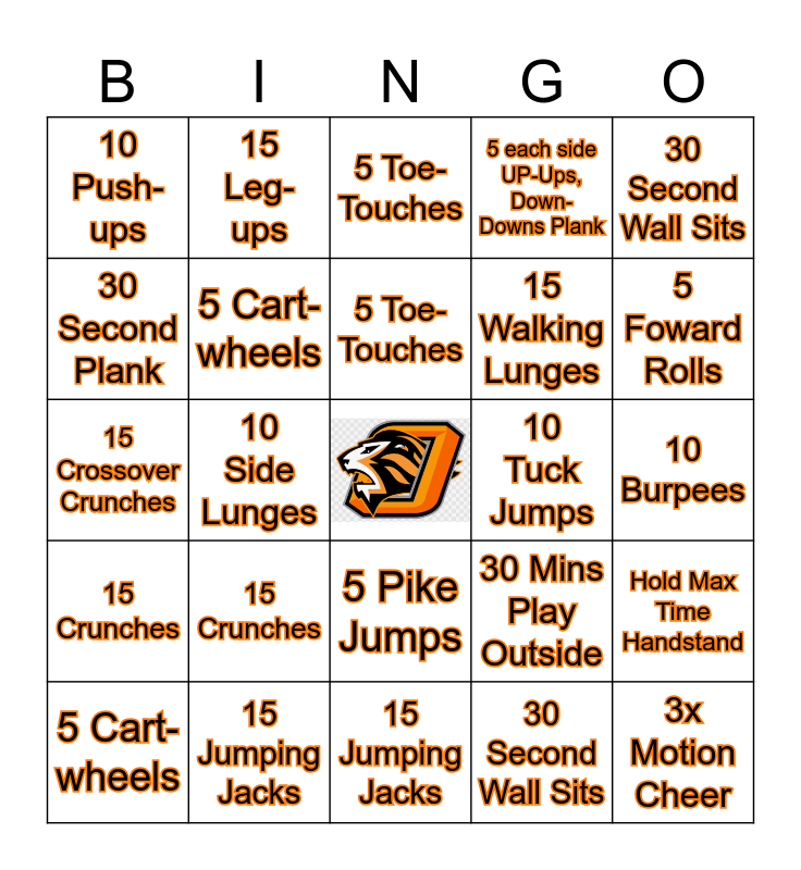 This bingo card has a free space and 24 words: 15 Crunches, 15 Jumping Jacks, 5 Toe-Touches, 5 Cart-wheels, 30 Second Wall Sits, 10 Push-ups, 30 Second Plank, 15 Leg-ups, 10 Tuck Jumps, 5 Pike Jumps, 15 Walking Lunges, 15 Crossover Crunches, 30 Mins Play Outside, Hold Max Time Handstand, 5 Cart-wheels, 30 Second Wall Sits, 10 Burpees, 5 Toe-Touches, 5 Foward Rolls, 10 Side Lunges, 3x Motion Cheer, 15 Crunches, 5 each side UP-Ups, Down-Downs Plank and 15 Jumping Jacks.