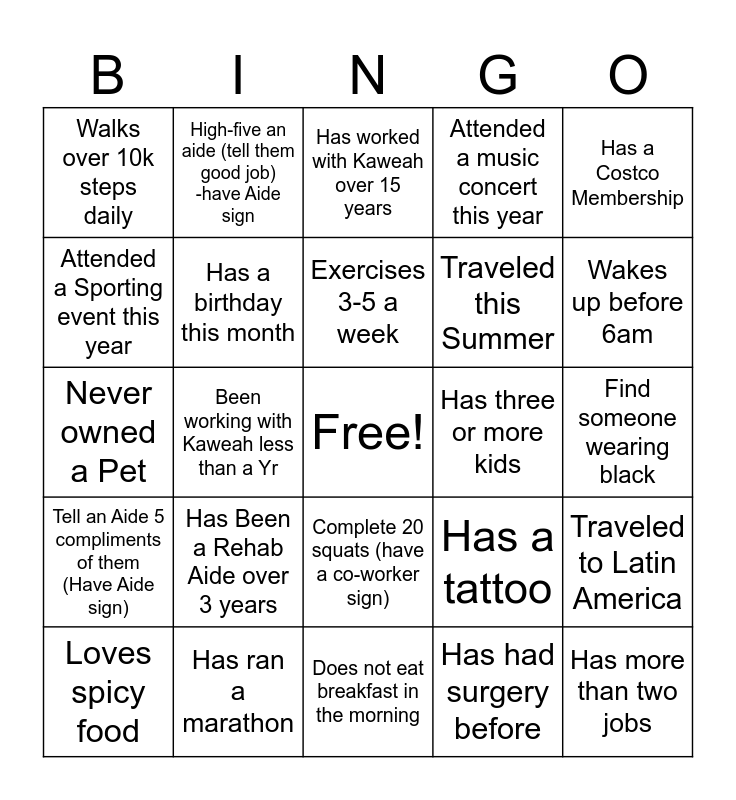 This bingo card has a free space and 24 words: Has Been a Rehab Aide over 3 years, Has ran a marathon, Exercises 3-5 a week, Loves spicy food, Has a Costco Membership, Walks over 10k steps daily, Attended a Sporting event this year, High-five an aide (tell them good job) -have Aide sign, Has three or more kids, Complete 20 squats (have a co-worker sign), Traveled this Summer, Never owned a Pet, Has a tattoo, Traveled to Latin America, Has a birthday this month, Has had surgery before, Find someone wearing black, Has worked with Kaweah over 15 years, Wakes up before 6am, Been working with Kaweah less than a Yr, Has more than two jobs, Tell an Aide 5 compliments of them (Have Aide sign), Attended a music concert this year and Does not eat breakfast in the morning.