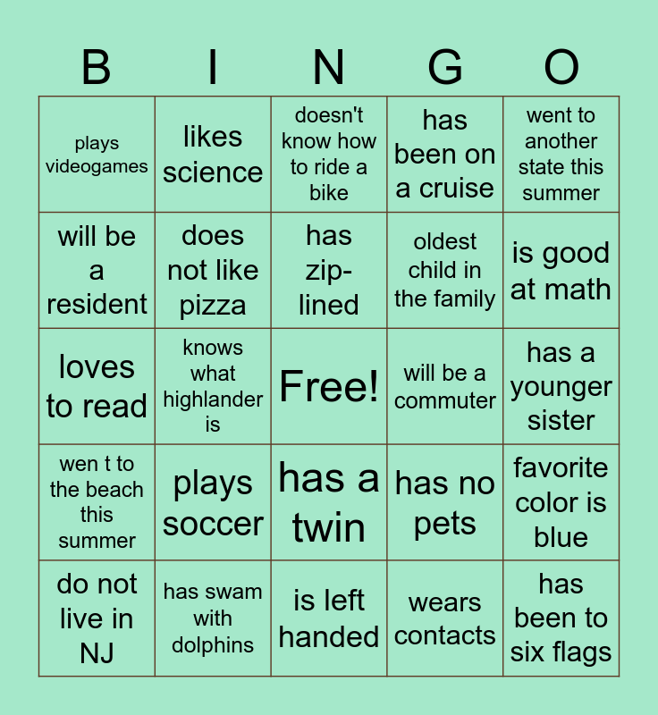 This bingo card has a free space and 24 words: plays soccer, has swam with dolphins, has zip-lined, do not live in NJ, went to another state this summer, plays videogames, will be a resident, likes science, will be a commuter, has a twin, oldest child in the family, loves to read, has no pets, favorite color is blue, does not like pizza, wears contacts, has a younger sister, doesn't know how to ride a bike, is good at math, knows what highlander is, has been to six flags, wen t to the beach this summer, has been on a cruise and is left handed.