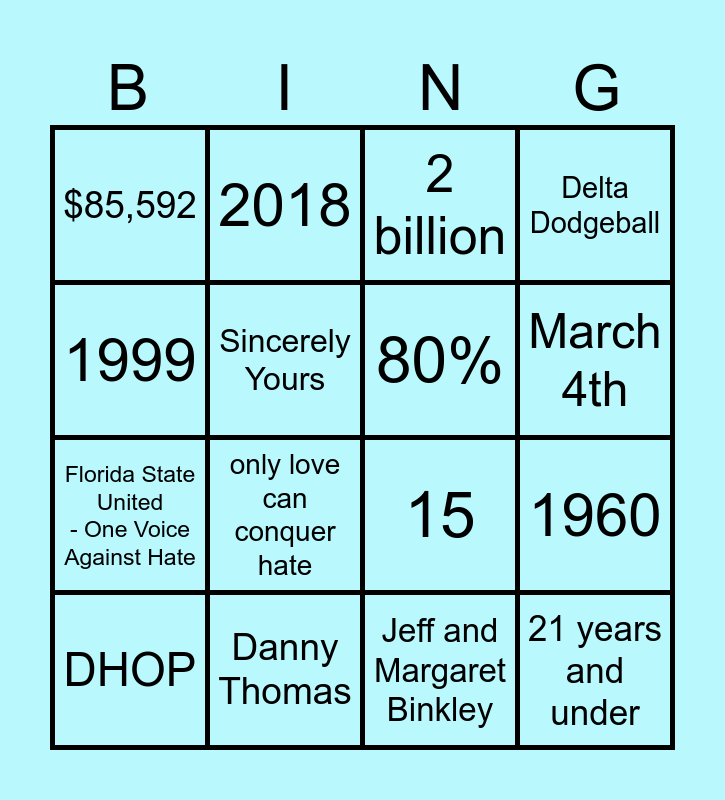This bingo card has 16 words: Danny Thomas, 1960, 2 billion, $85,592, Florida State United - One Voice Against Hate, 2018, 15, Jeff and Margaret Binkley, 1999, Sincerely Yours, DHOP, Delta Dodgeball, only love can conquer hate, March 4th, 80% and 21 years and under.