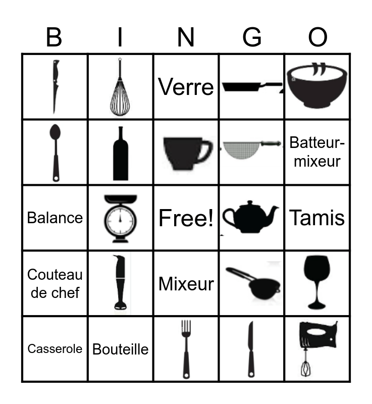 This bingo card has 24 images, a free space and 24 words: Passoire, Batteur-mixeur, Casserole, Fourchette, Mixeur, Couteau de chef, Fouet, Ouvreur, Cuillère, Râpe, Bouteille, Sauteuse, Coupe, Tamis, Planche à decouper, Presse-purée, Tasse, Théière, Verre, Bol, Balance, Couteau, Couteau d'office and Plat à four.