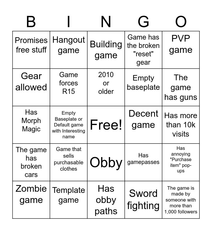 This bingo card has a free space and 24 words: Game that sells purchasable clothes, Template game, 2010 or older, Zombie game, PVP game, Promises free stuff, Gear allowed, Hangout game, Decent game, Obby, Empty baseplate, Has Morph Magic, Has gamepasses, Has annoying "Purchase item" pop-ups, Game forces R15, Sword fighting, Has more than 10k visits, Building game, The game has guns, Empty Baseplate or Default game with Interesting name, The game is made by someone with more than 1,000 followers, The game has broken cars, Game has the broken "reset" gear and Has obby paths.