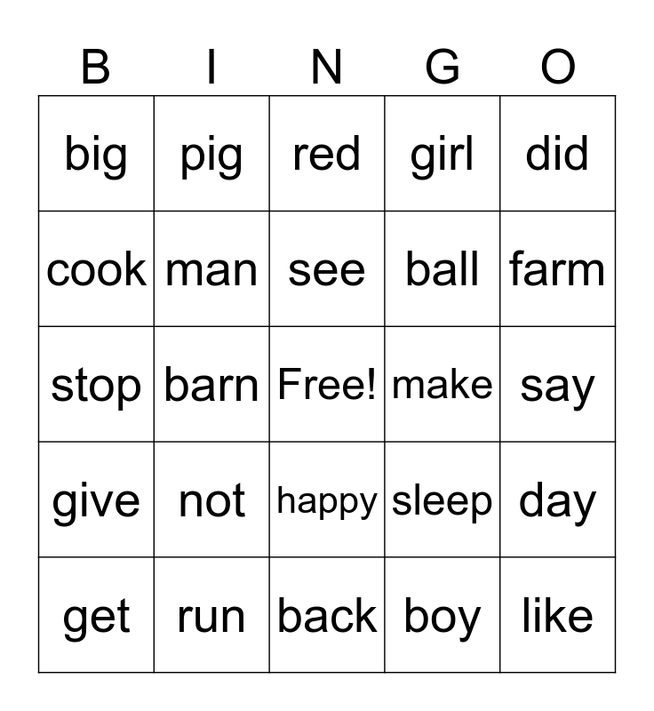 This bingo card has a free space and 24 words: not, run, see, get, did, big, cook, pig, make, happy, ball, stop, sleep, day, man, boy, say, red, farm, barn, like, give, girl and back.