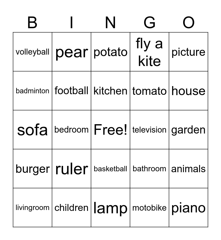 This bingo card has a free space and 24 words: ruler, children, kitchen, livingroom, picture, volleyball, badminton, pear, television, basketball, tomato, sofa, bathroom, animals, football, motobike, garden, potato, house, bedroom, piano, burger, fly a kite and lamp.