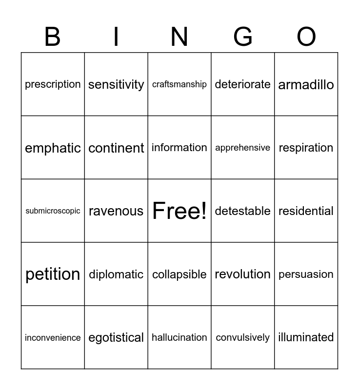 This bingo card has a free space and 45 words: diminutive, illuminated, elevation, inconvenience, immaculate, convulsively, craftsmanship, concentration, armadillo, egotistical, deteriorate, detestable, collapsible, diplomatic, disintegrate, hallucination, extraordinary, submicroscopic, tremendously, respiration, sensitivity, visibility, vicinity, prescription, monotonously, residential, manuscript, precision, revolution, petition, pestilential, persuasion, perspiration, permission, pedestrian, ravenous, decompression, extension, inducement, information, emphatic, apprehensive, apparition, continent and composition.