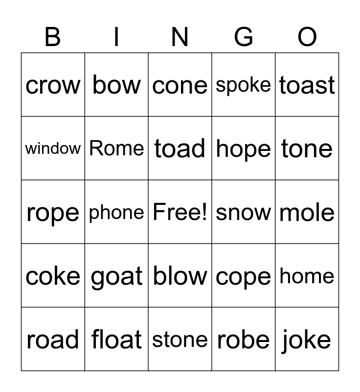 This bingo card has a free space and 24 words: goat, float, toad, road, toast, crow, window, bow, snow, blow, hope, rope, cope, home, Rome, robe, mole, cone, tone, phone, joke, coke, spoke and stone.