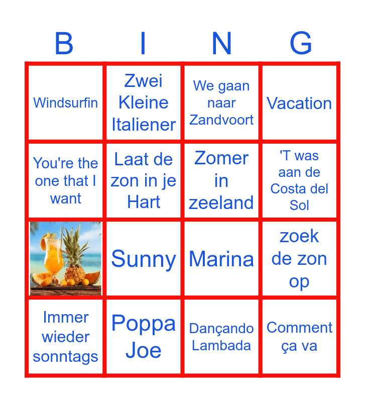 This bingo card has 1 images and 19 words: zoek de zon op, Quiero, We gaan naar Zandvoort, My Friend the Wind, Immer wieder sonntags, You're the one that I want, Poppa Joe, Windsurfin, Zwei Kleine Italiener, Sunny, Marina, Laat de zon in je Hart, Comment ça va, Zomer in zeeland, Tulpen uit Amsterdam, 'T was aan de Costa del Sol, Vacation, Dançando Lambada and Brabant.