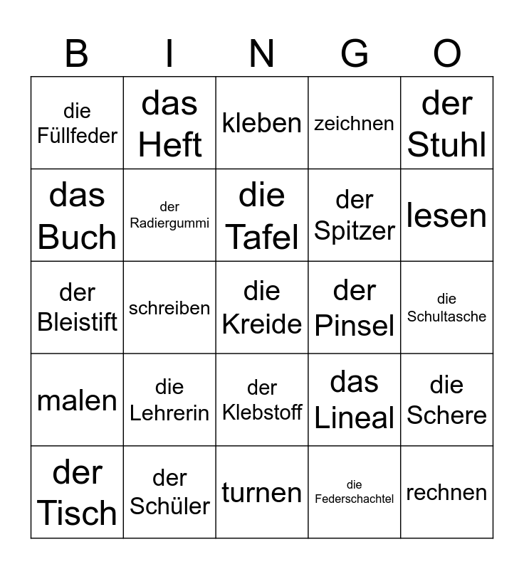 This bingo card has a free space and 24 words: die Lehrerin, der Schüler, die Tafel, der Tisch, der Stuhl, die Füllfeder, das Buch, das Heft, der Pinsel, der Klebstoff, der Spitzer, der Bleistift, das Lineal, die Schere, der Radiergummi, die Federschachtel, die Schultasche, kleben, lesen, schreiben, rechnen, malen, zeichnen and turnen.
