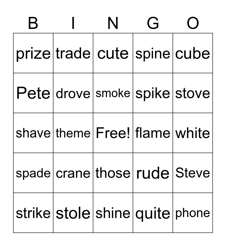 This bingo card has a free space and 29 words: strike, chime, theme, broke, prize, cute, drove, crane, flame, stole, white, phone, shine, quite, stove, place, those, spade, cube, shave, rude, shake, spike, Pete, spine, trade, Steve, smoke and glide.