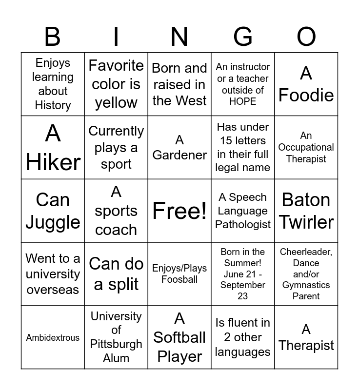 This bingo card has a free space and 34 words: Has worked for HOPE for over 10 years, Is fluent in 2 other languages, Loves Sushi, Went to a university outside of Pennsylvania and its surrounding states: Delaware, Maryland, New York, New Jersey, Ohio and West Virginia, Went to a university overseas, Currently plays a sport, A Foodie, Ambidextrous, Favorite color is yellow, Favorite Subject is Science, A Gardener, Born and raised in the West, A fan of the NFL’s Chiefs, Patriots or Buccaneers, A Paraprofessional, A Speech Language Pathologist, An Occupational Therapist, University of Pittsburgh Alum, Can Juggle, Can do a split, Born in the Summer! June 21 - September 23, Enjoys/Plays Foosball, Enjoys Dirt Bikes, Enjoys learning about History, Baton Twirler, A Softball Player, A Therapist, An instructor or a teacher outside of HOPE, Has a pet besides a dog, cat or fish, Has under 15 letters in their full legal name, A Hiker, An Artist/, A sports coach, Cheerleader, Dance and/or Gymnastics Parent and An introvert.