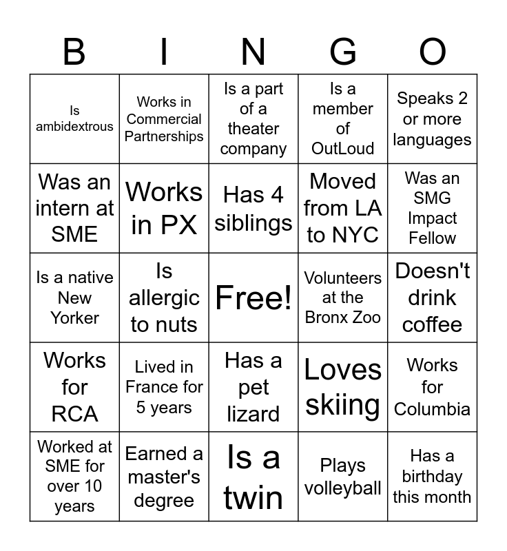 This bingo card has a free space and 24 words: Lived in France for 5 years, Earned a master's degree, Has 4 siblings, Worked at SME for over 10 years, Speaks 2 or more languages, Is ambidextrous, Was an intern at SME, Works in Commercial Partnerships, Volunteers at the Bronx Zoo, Has a pet lizard, Moved from LA to NYC, Is a native New Yorker, Loves skiing, Works for Columbia, Works in PX, Plays volleyball, Doesn't drink coffee, Is a part of a theater company, Was an SMG Impact Fellow, Is allergic to nuts, Has a birthday this month, Works for RCA, Is a member of OutLoud and Is a twin.