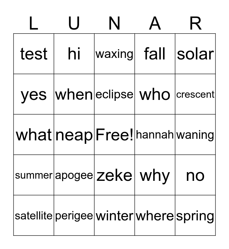 This bingo card has a free space and 24 words: apogee, perigee, eclipse, satellite, solar, test, yes, hi, hannah, zeke, who, what, why, no, when, where, waning, waxing, crescent, neap, spring, summer, fall and winter.