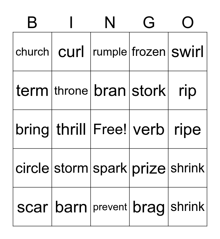 This bingo card has a free space and 24 words: storm, barn, bran, scar, swirl, church, term, curl, verb, spark, stork, bring, prize, shrink, throne, brag, ripe, rumple, rip, thrill, shrink, circle, frozen and prevent.