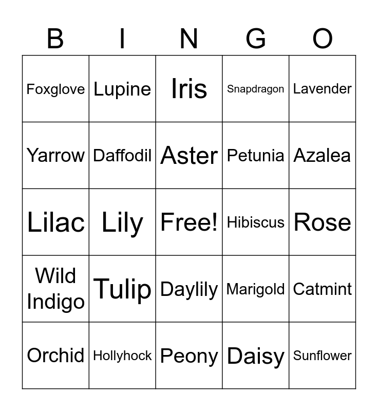 This bingo card has a free space and 29 words: Orchid, Dahlia, Lily, Poppy, Foxglove, Iris, Daffodil, Tulip, Hibiscus, Hollyhock, Rose, Sunflower, Peony, Daisy, Azalea, Begonia, Daylily, Wild Indigo, Lavender, Lilac, Marigold, Pansy, Petunia, Yarrow, Snapdragon, Lupine, Catmint, Aster and Allium.