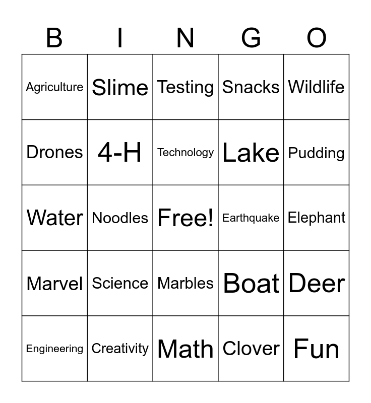 This bingo card has a free space and 25 words: Science, Math, Technology, Engineering, Wildlife, Agriculture, Drones, Slime, Earthquake, Marbles, Lake, Water, Boat, Deer, 4-H, Animals, Elephant, Testing, Pudding, Noodles, Fun, Creativity, Marvel, Snacks and Clover.