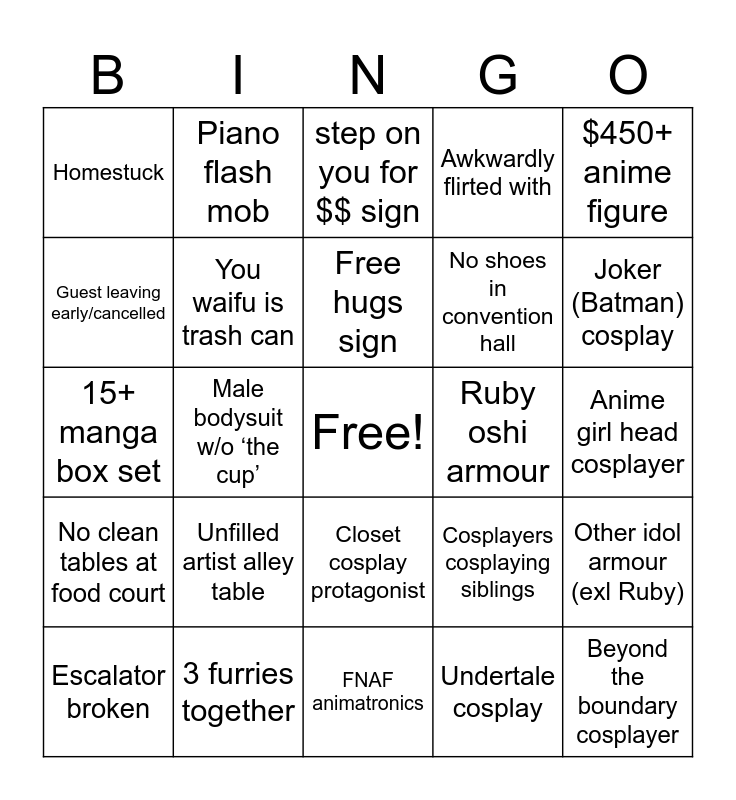 This bingo card has a free space and 29 words: Escalator broken, Underage character body pillow, Male bodysuit w/o ‘the cup’, Full body paint, Homestuck, step on you for $$ sign, You waifu is trash can, Unfilled artist alley table, Ruby oshi armour, 3 furries together, Anime girl head cosplayer, Beyond the boundary cosplayer, FNAF animatronics, Undertale cosplay, Joker (Batman) cosplay, Kill La kill cosplay (underwear), Closet cosplay protagonist, No clean tables at food court, $450+ anime figure, 15+ manga box set, Cosplayers cosplaying siblings, Cosplayer on a guided leash, No shoes in convention hall, Guest leaving early/cancelled, Awkwardly flirted with, Piano flash mob, Other idol armour (exl Ruby), Free hugs sign and moistcr1tikal cosplay.